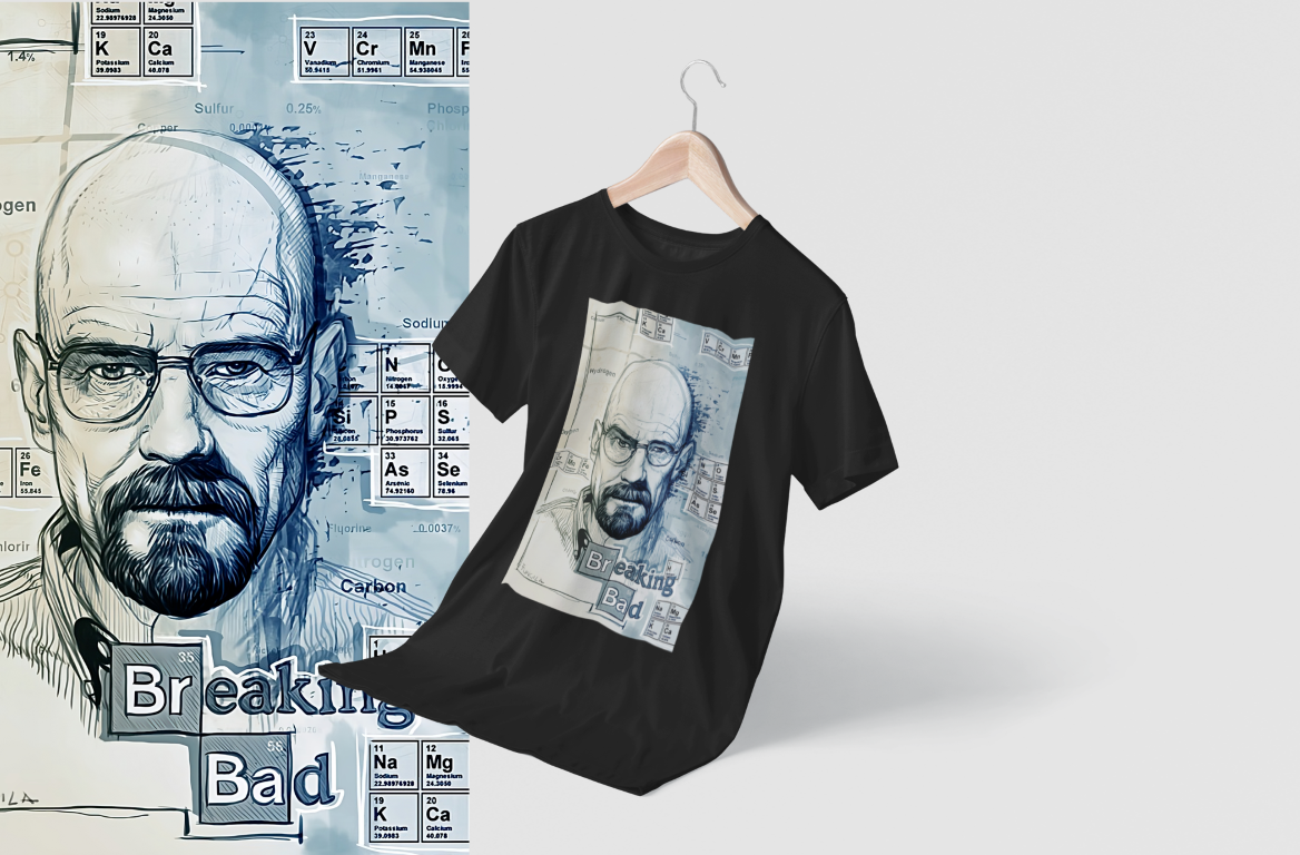 Made from 100% super-combed cotton and treated with a bio-wash finish, it’s incredibly soft, breathable, and designed for all-day wear. The star of the show? A premium DTF (Direct to Film) print that showcases Walter White with scientific elements in razor-sharp detail.