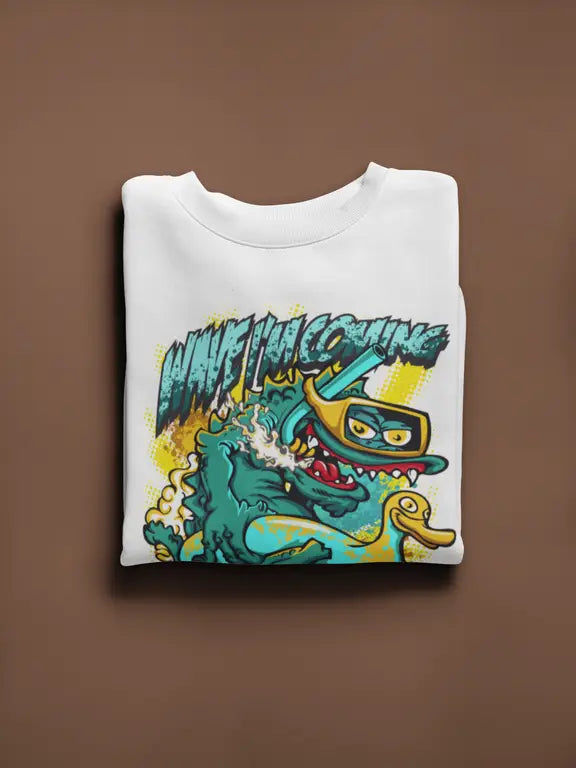 Features a bold, comic-style crocodile-dragon creature ready to conquer ocean waves