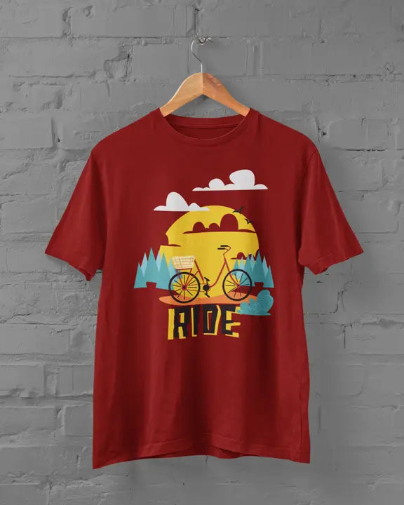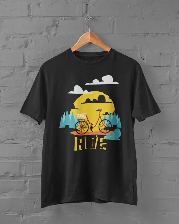 Gear up for a ride that never ends — even when you're just lounging around! Our RIDE T-shirt features a beautifully illustrated bicycle journeying into the wilderness, framed by trees, a glowing yellow sun, and serene skies. It’s the perfect tee for cyclists, adventurers, and dreamers alike.