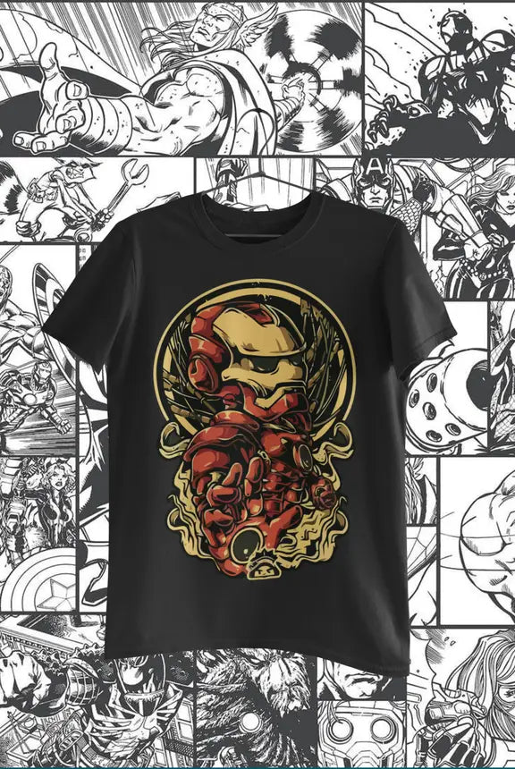 Features a vector-style Iron Man design in crisp detail and vibrant color